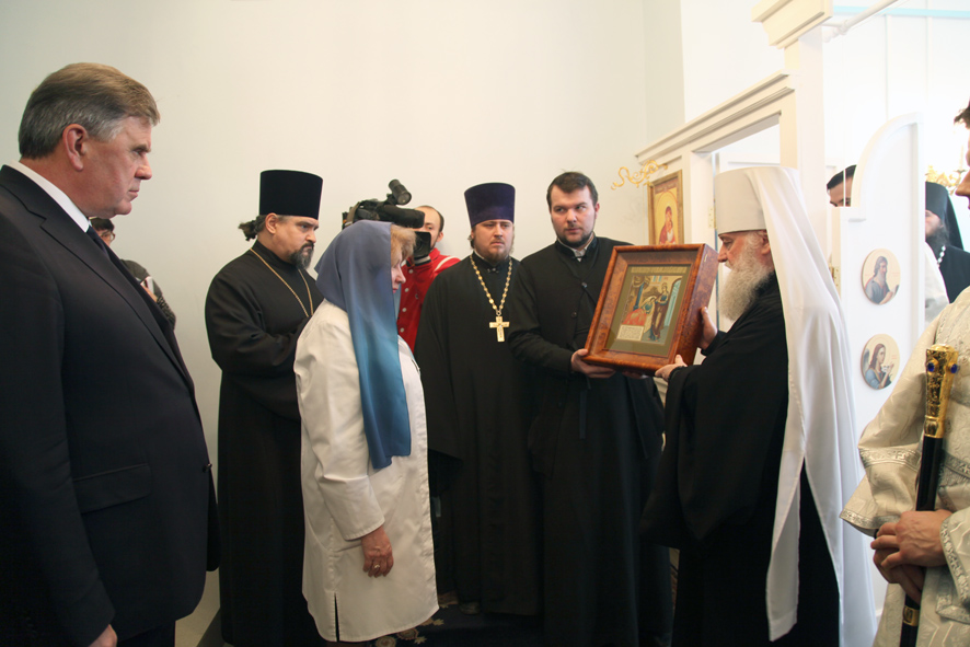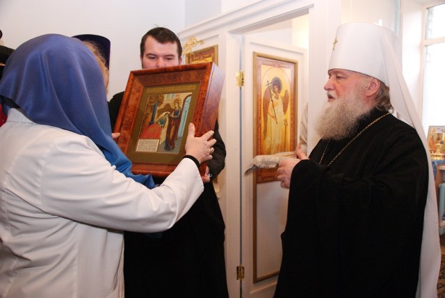 После освящения владыка вручил в дар больничному храму икону Божией Матери «Целительница», написанную художниками иконописной мастерской Ставрос